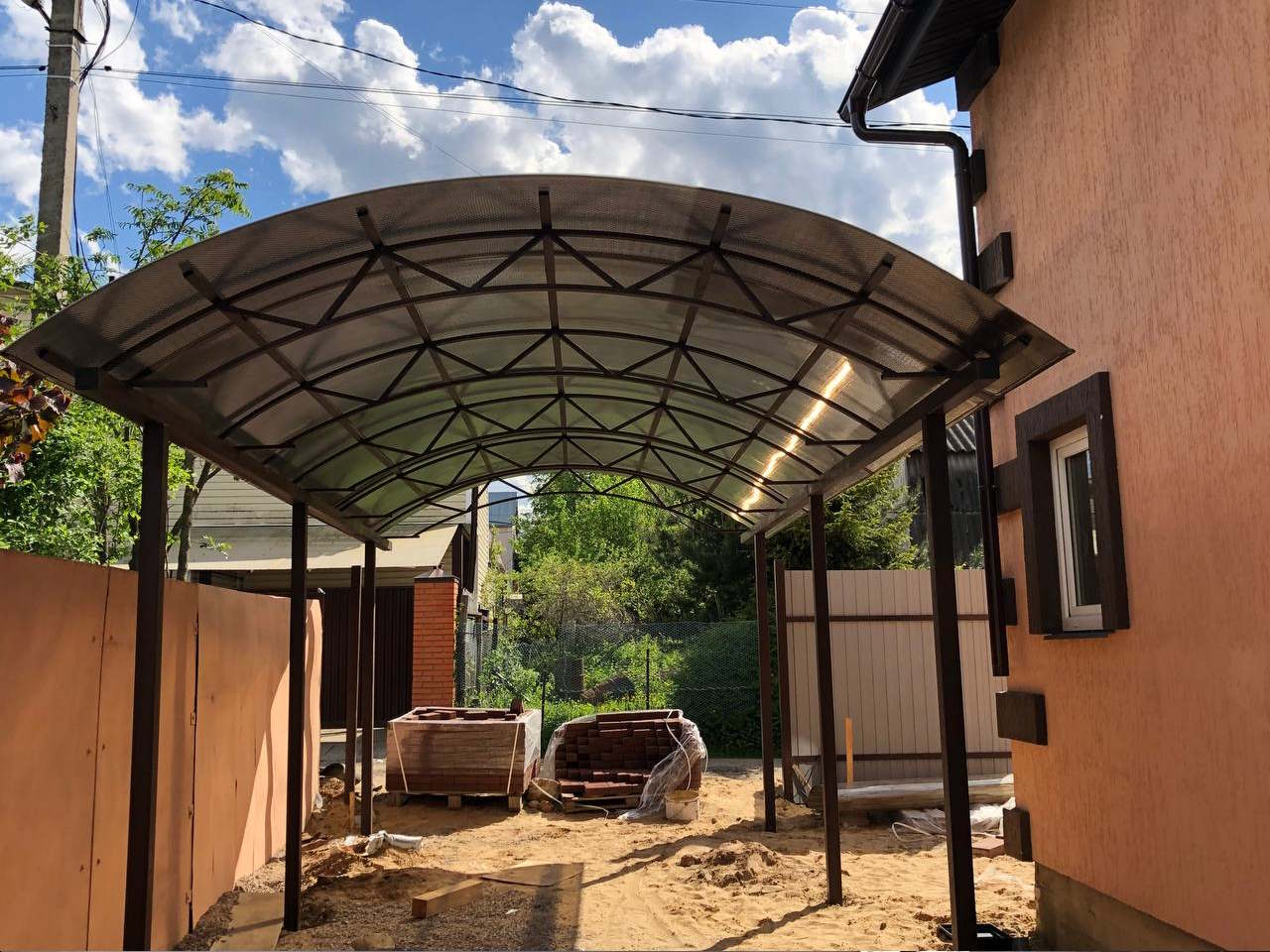 За день на даче изготовили арочный навес 5 на 7 с покрытием поликарбоната. Привезли уже готовые крашенные фермы и весь остальной материал. Все за собой убрали и увезли мусор. Молодцы!